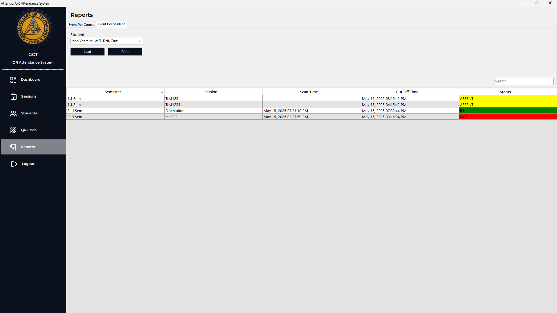 The GCT QR Attendance System is an offline desktop tool for tracking attendance with QR codes and barcode scanners, featuring session management, ID generation, reporting, and secure MSSQL + bcrypt authentication.